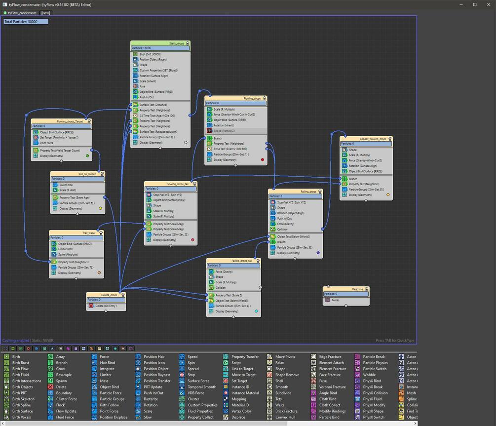 Полностью процедурный сетап конденсата сделанный с помощью плагина tyflow в 3dsmax